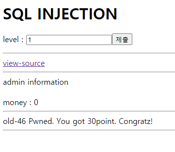 SQL INJECTION 문구와 level 을 입력하는 창에 1이 입력된 채로 존재하고 view-source 링크가 존재한다.