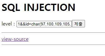 그렇게 입력창에 입력할 때에는 1&&id=char(97,100,109,105,110) 를 입력해주면 해당 문제가 풀린다.